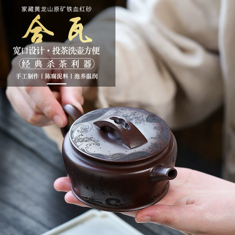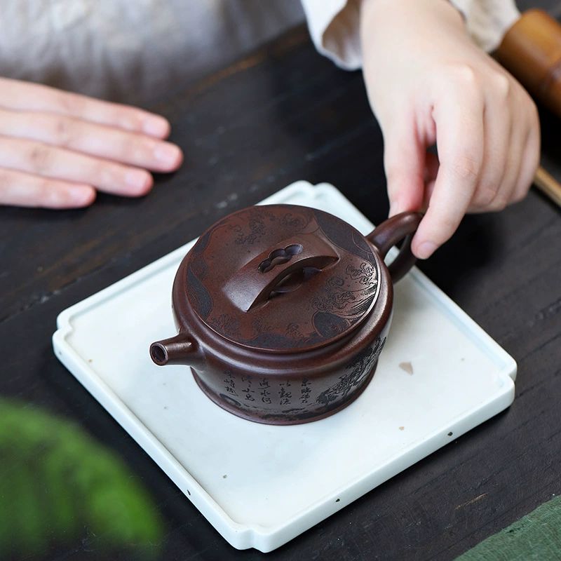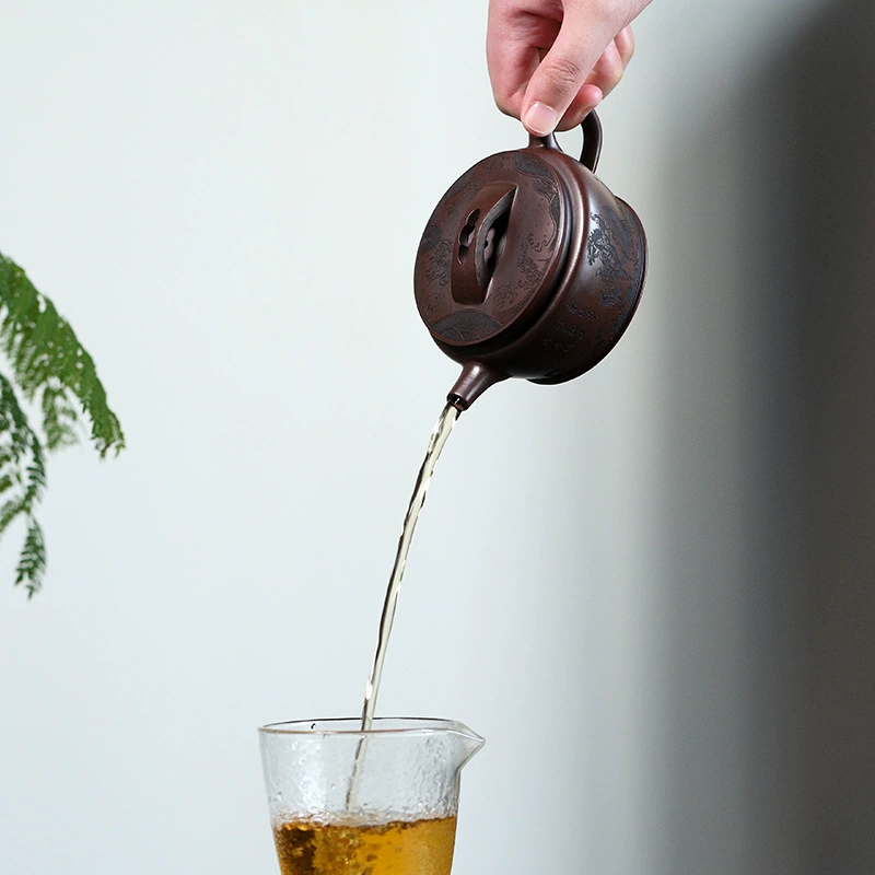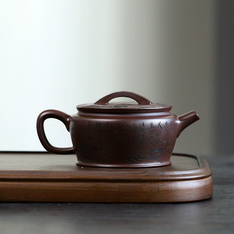 This teapot features a straight tile-shaped body, wide opening and flat lid like a bronze mirror, with an arch knob. The shoulder lines flow smoothly into the spout and handle, creating an elegant, flowing rhythm. Clear, steady lines reflect the artisan’s superb skill.