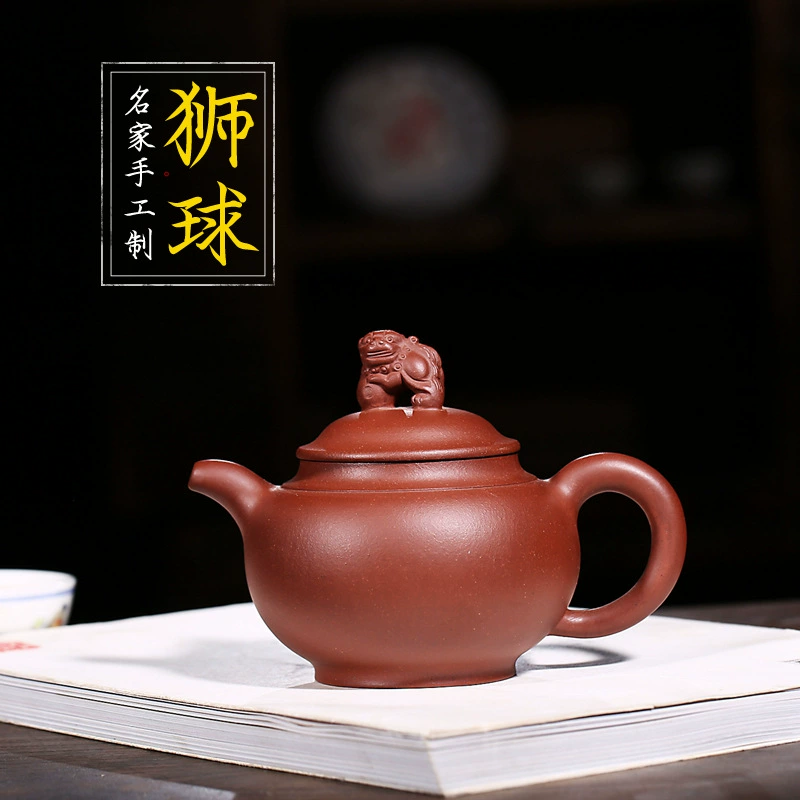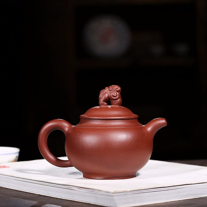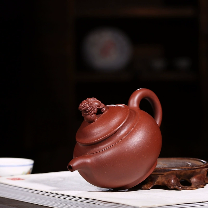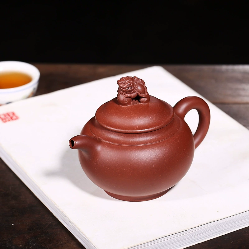 This teapot is designed with the auspicious lion as its theme, featuring a gentle and elegant shape. Made from premium original ore purple clay, it has a smooth, rounded body with graceful lines. The straight spout provides strong, smooth pouring, while the ear-shaped handle blends naturally with the body like a lion’s tail. The lid is decorated with a majestic lion knob, symbolizing good fortune and blessing.