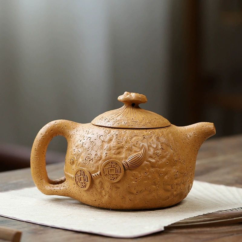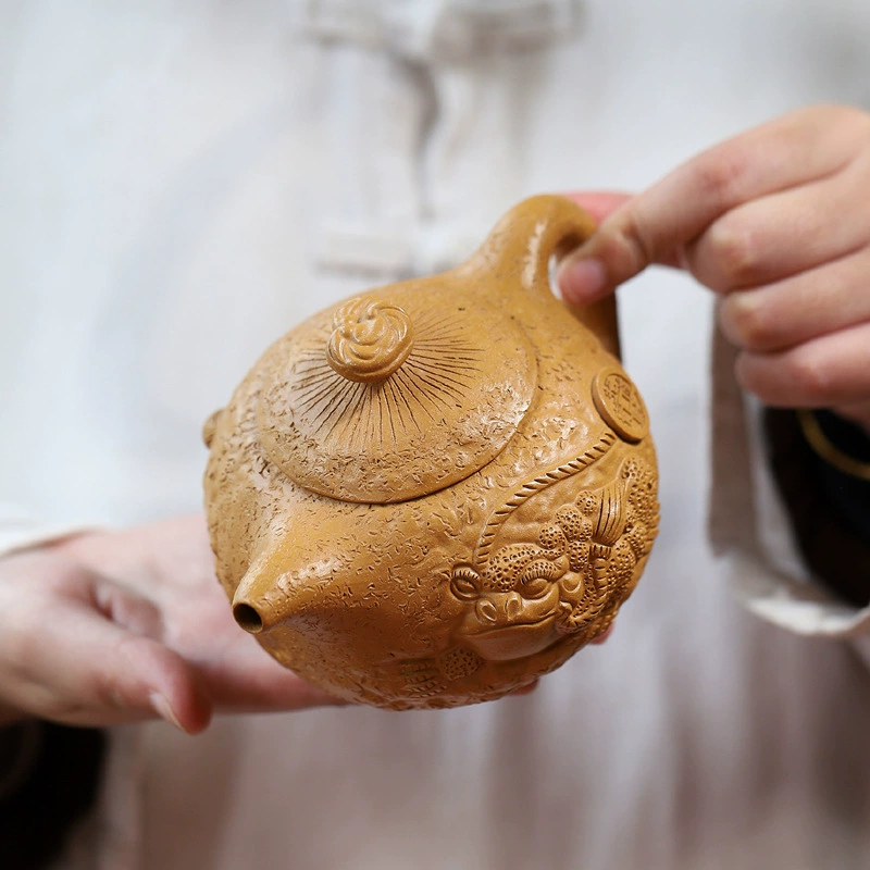 This Gongchun teapot carries the classic rustic charm of traditional tree-bark style, with regularly arranged knot textures across the body. Slim, symmetrical spout and handle create elegant balance, while a golden toad ornament highlights the blessing theme and adds unique artistic character. The whole pot is round, steady, and full of ancient simplicity.
