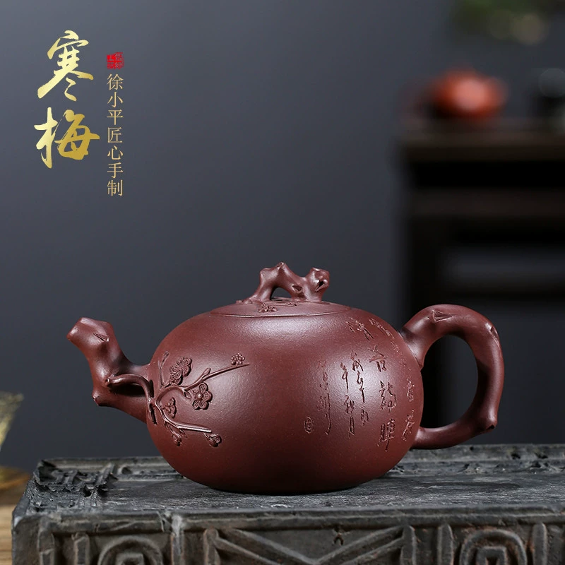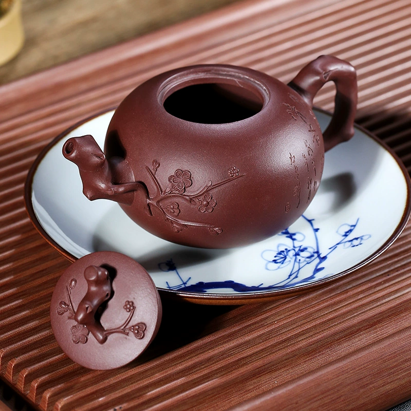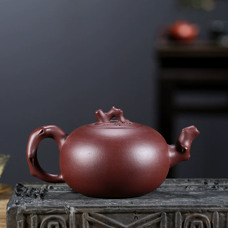This teapot combines plum blossom elements with a smooth, simple design, featuring exquisite appearance and realistic decorations. It has a round, full spherical body, a raised lid that matches the body, and a withered vine knob. The spout and handle are shaped like plum branches with blooming flowers, exuding elegance and symbolizing noble pursuit and extraordinary taste.