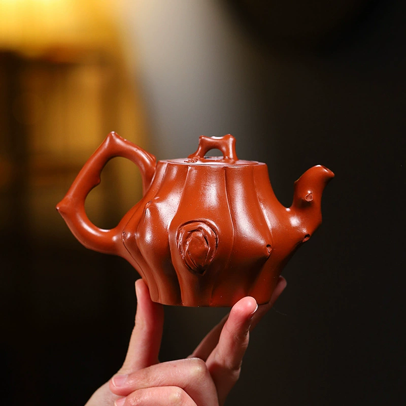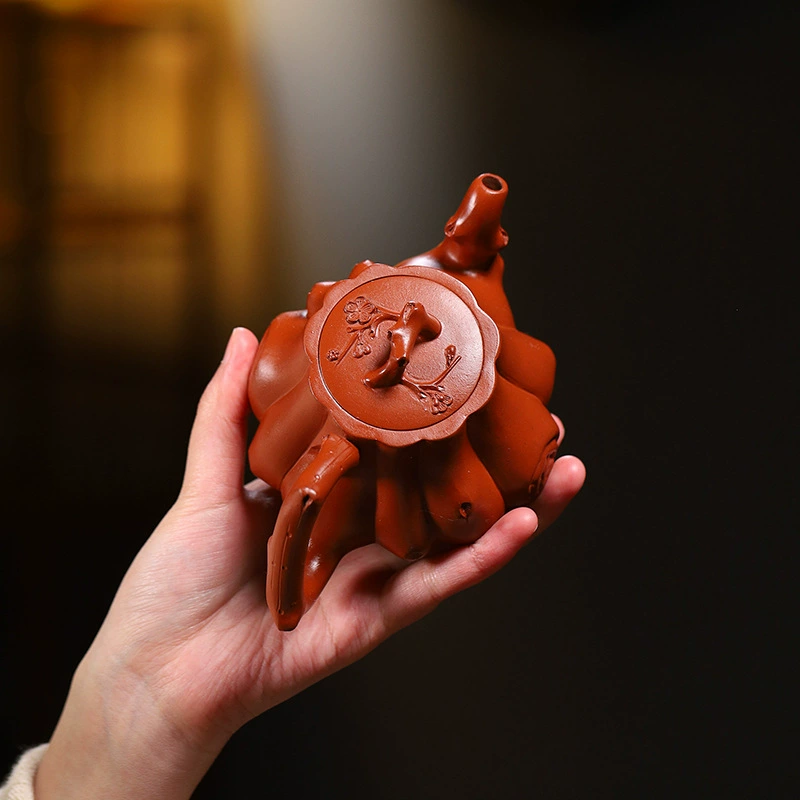 Also known as the Plum Trunk Teapot, this is a classic realistic-style Yixing zisha teapot modeled after an aged plum branch. The plum blossoms are applied using the traditional stacking clay technique, creating vivid, three-dimensional details. The body resembles a sturdy, ancient plum stump, while the spout and handle extend naturally like short branches, giving the whole piece the presence of a refined sculpture.