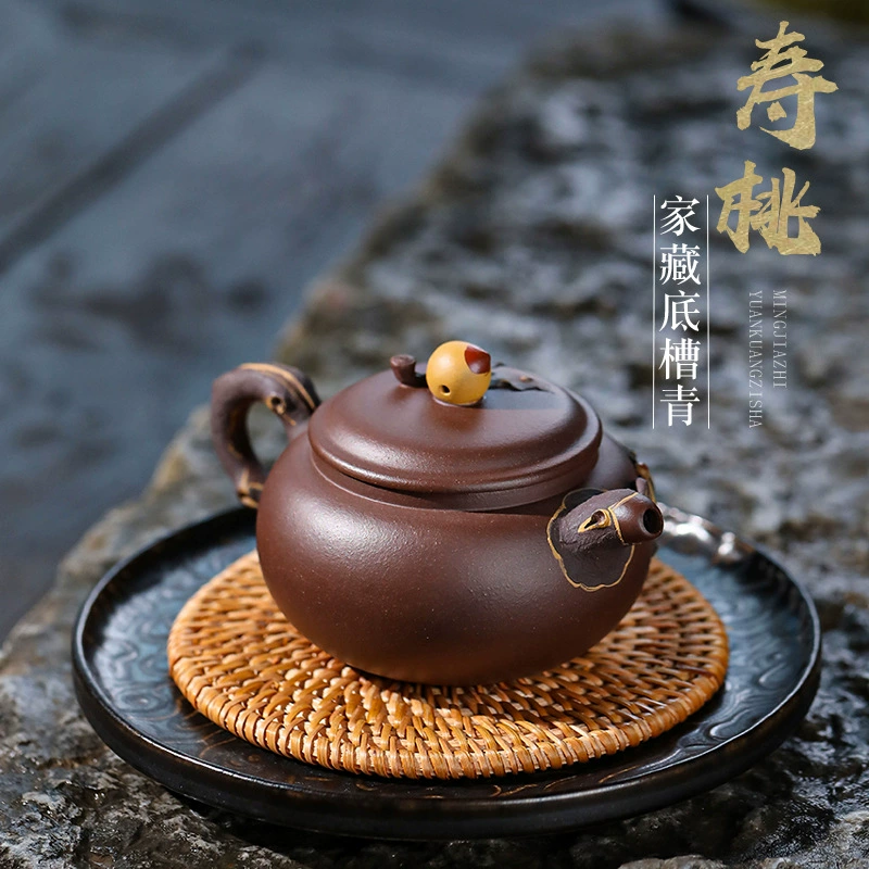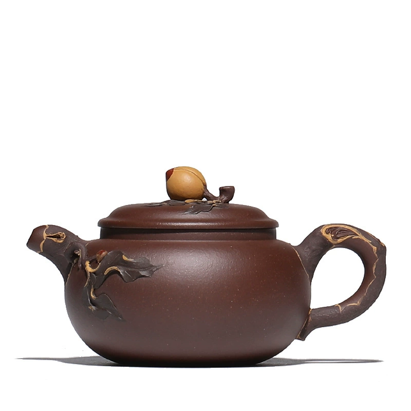 This Longevity Peach teapot uses peach motifs rather than a full peach shape, achieving a lovely and realistic effect. It has a flattened spherical body with a stable base and smooth lid. The short spout flows naturally, while the ear-shaped handle creates a gentle, rounded feel. The knob is a vivid ripe peach, with applied peach and leaf decorations on the body.
