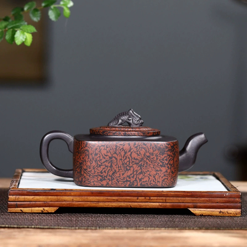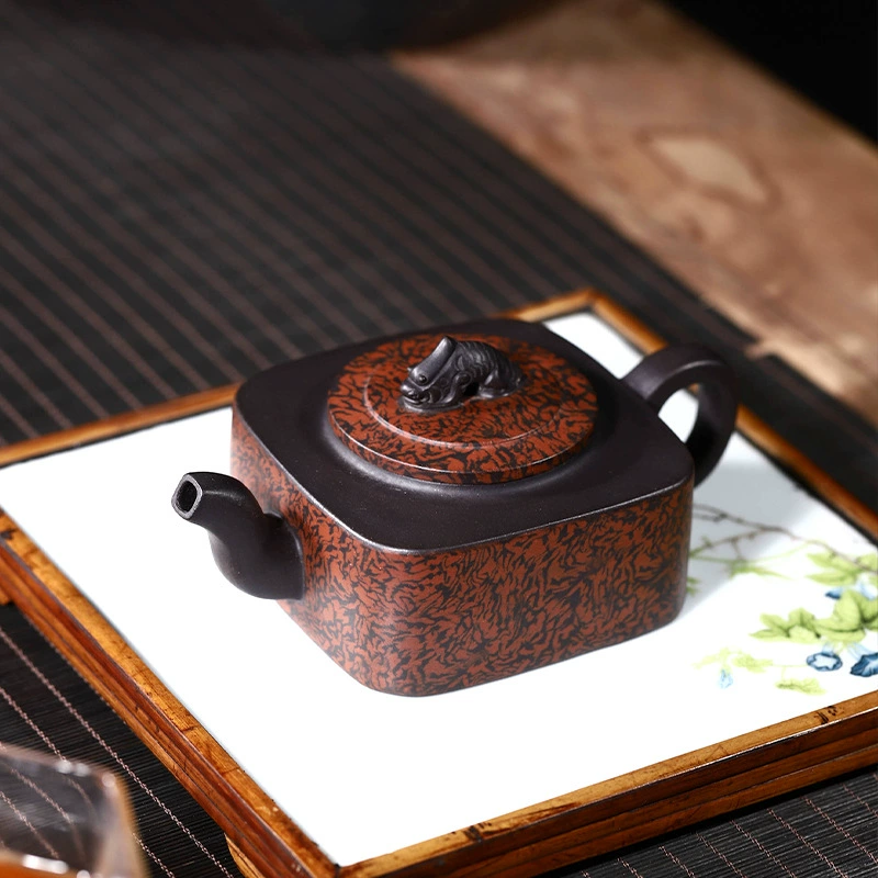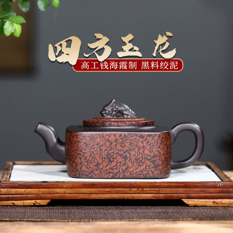 This Sifang Yulong Teapot is crafted by Qian Haixia, a Senior Arts and Crafts Master. Made from rare black clay and crafted with exquisite marbled clay technique, its body features natural textures of profound jet black blended with ochre. The shape combines square forms with subtle rounded lines, with a flat, stretched belly. It fuses the simple, sturdy charm of traditional purple clay with the aesthetic beauty of modern textures, making it a distinctive and ingenious masterpiece of Yixing purple clay art.