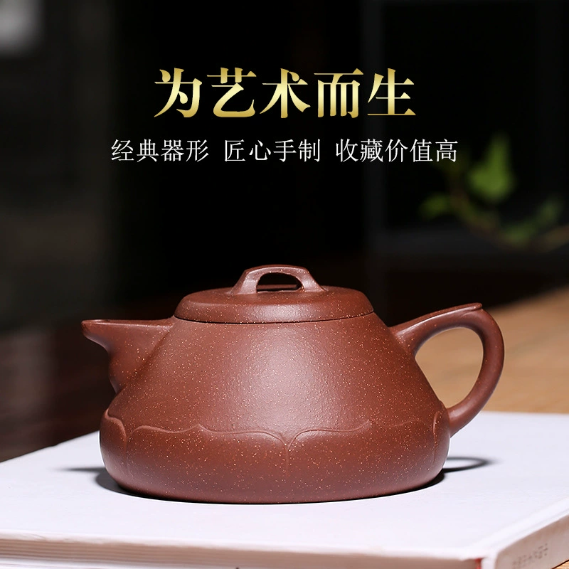 100-word Description: This handcrafted lotus ladle teapot, made of original Dicaoqing clay, has an elegant shape with exquisite lotus decorations. Its round body, curved spout and square-circle handle are well-proportioned. It comes with complete accessories including a collection certificate and brocade box. The clay develops a warm patina with use, suitable for tea tasting and collection, combining beauty and practicality.