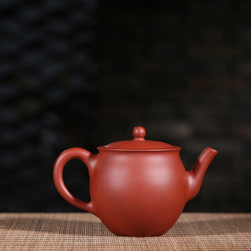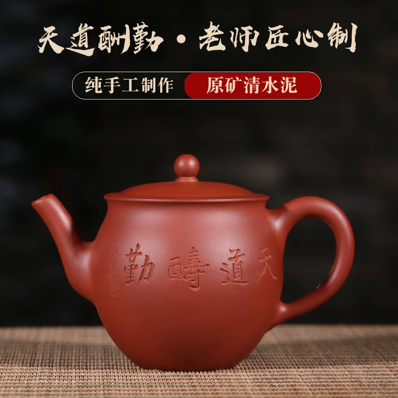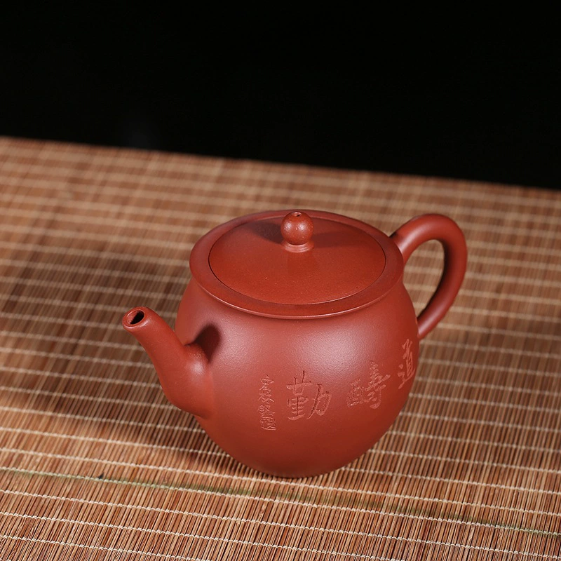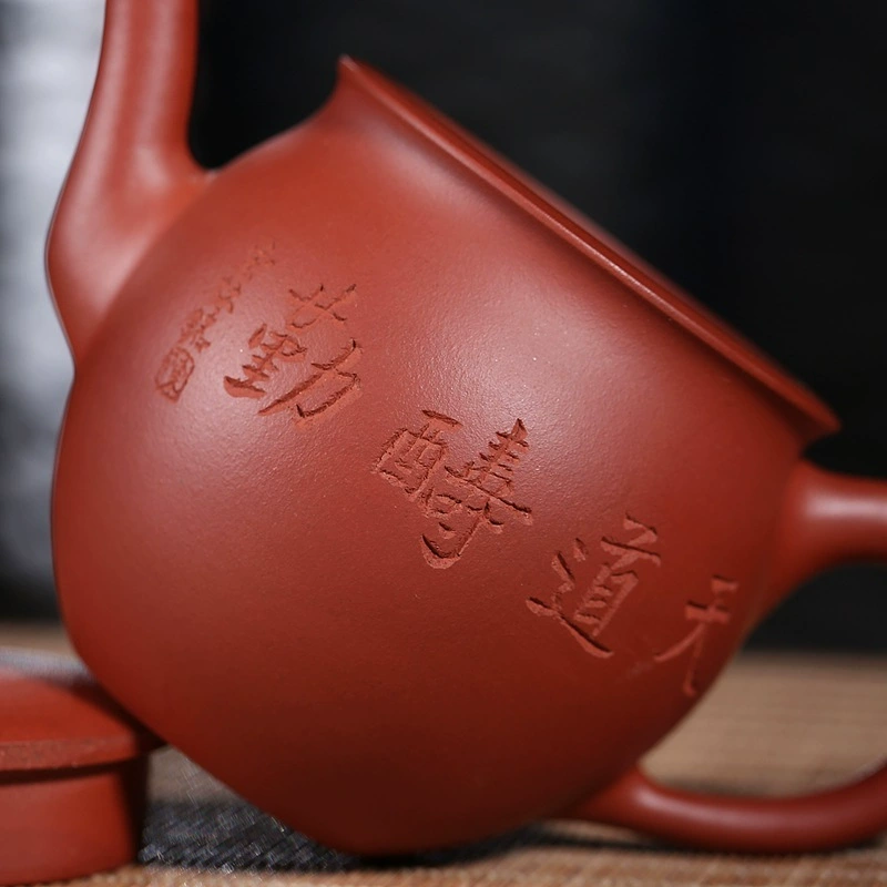 This handmade teapot features elegant inscriptions, a classic rustic style, and excellent practicality. The lid fits neatly into the body with a smooth raised design. The pearl-shaped knob is delicate and refined. The curved spout blends naturally with the body, and the RuYi bridge knob adds gentle grace. The teapot is elegant, generous, simple yet refined.