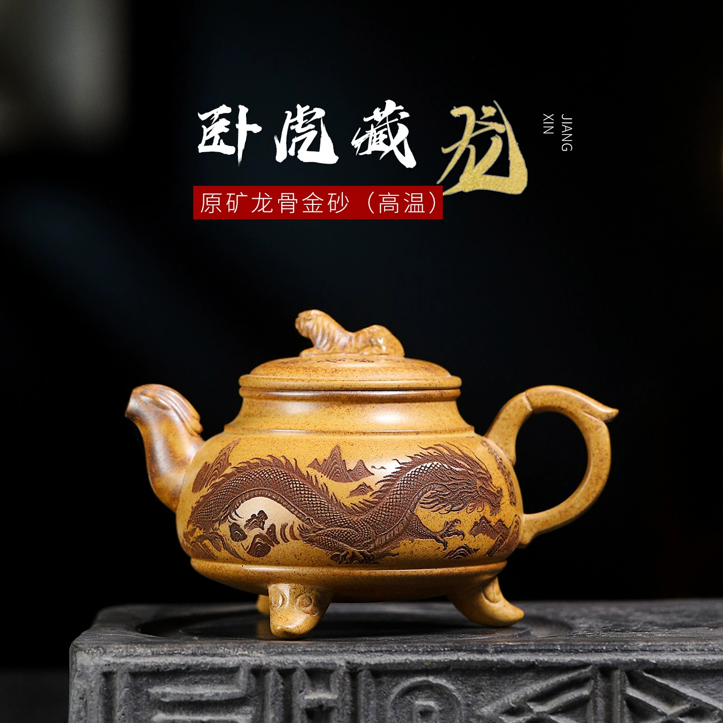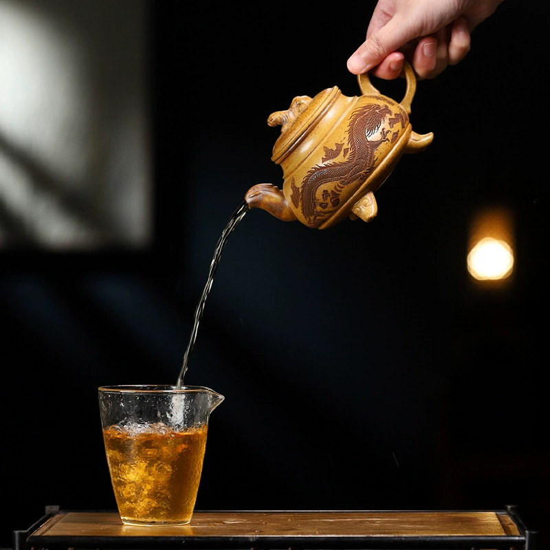 Inspired by “Crouching Tiger Hidden Dragon”, this teapot has a thick, full shape that exudes a sense of steadiness. The curved handle is comfortable to hold, and the slightly bent spout is symmetrical to the handle—both are shaped like dragons, exuding extraordinary dominance. Supported by three tripod feet, the tiger-shaped knob fits the theme perfectly, filling the whole teapot with strength and charm that integrates with its theme.