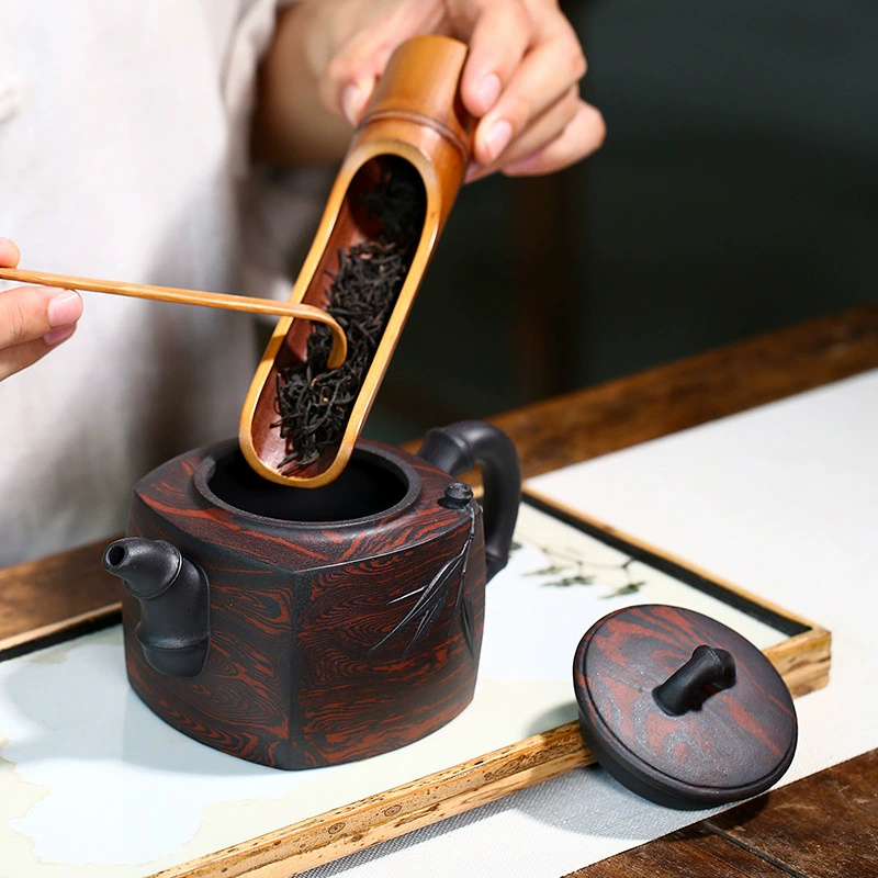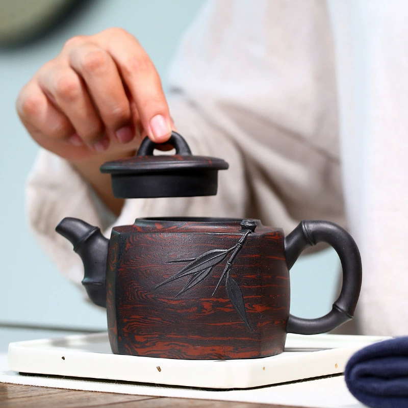 This teapot boasts an elegant and refined shape, with a smooth, jade-like texture on the surface and a noble temperament. The square pot body is perfectly combined with bamboo joint-shaped spout, handle and knob, showing the integrity and elegance of bamboo. The clever integration of square pot and bamboo elements reflects the pursuit and taste of traditional literati, and the bamboo decorations also convey an unyielding vitality.