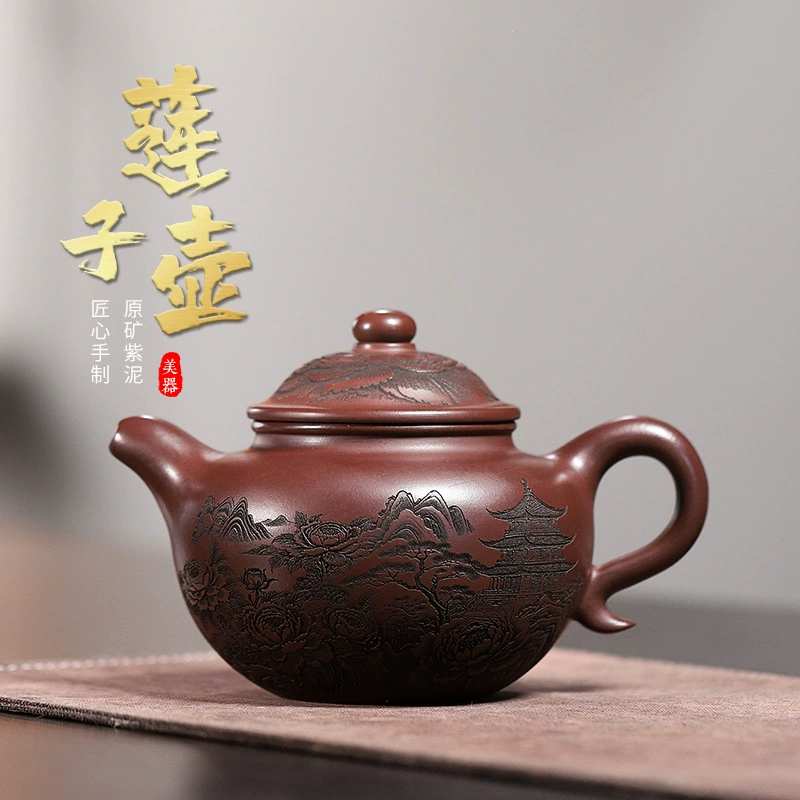 Introduction: This teapot features a traditional lotus seed shape, with a subtly curved spout that connects seamlessly to the body. The ear-shaped handle is broad yet elegant, complementing the pot perfectly. The lid fits tightly with a polished knob, creating a harmonious and refined appearance.