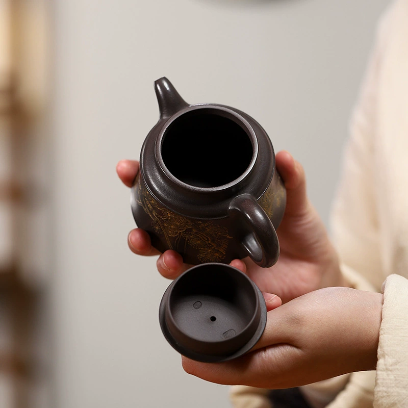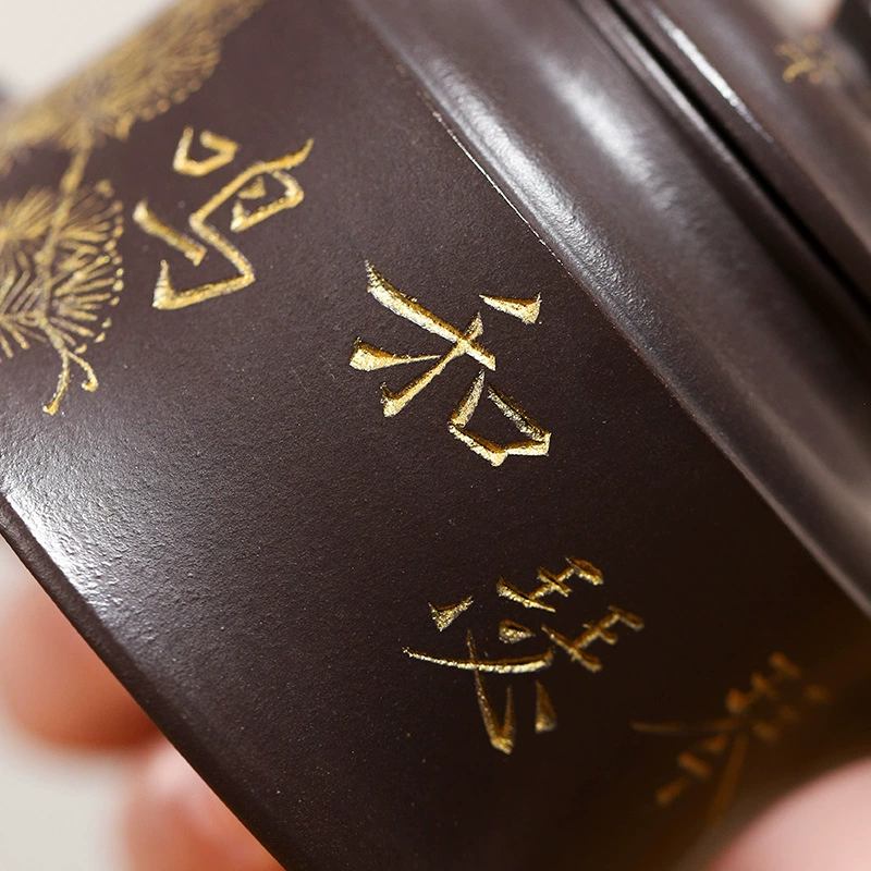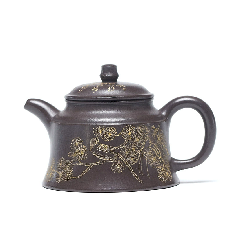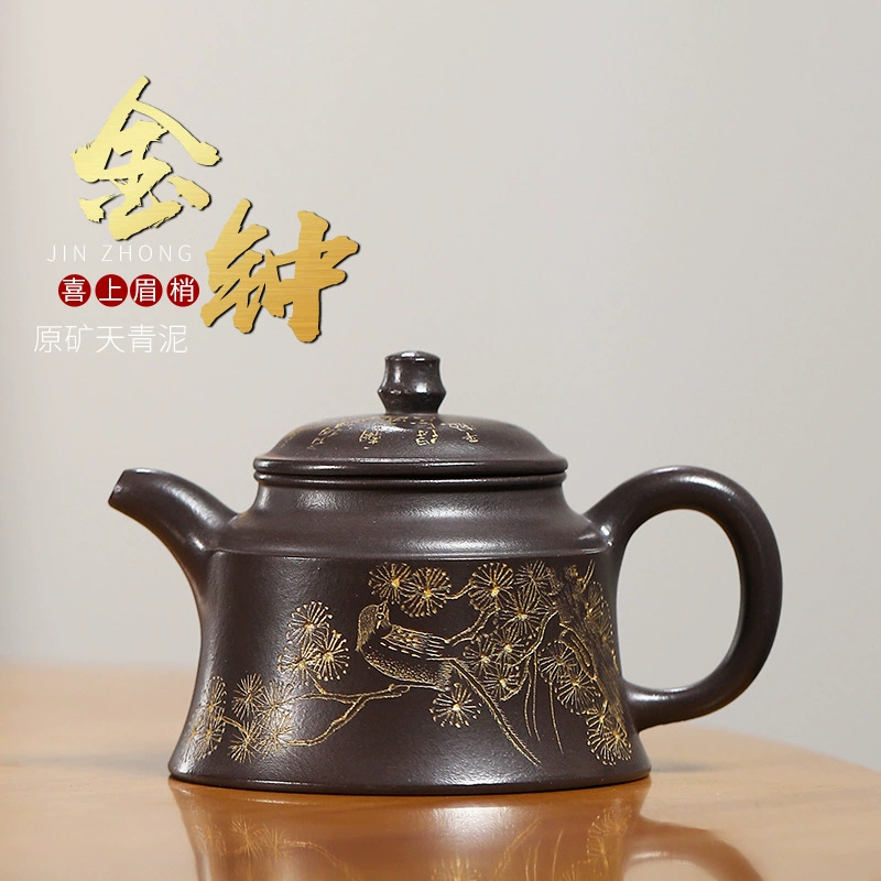 The Jinzhong (Golden Bell) Teapot is one of the classic handmade Yixing purple clay teapot shapes. As an authentic Yixing purple clay teapot, its body resembles a small bell, with rounded lines combined with neat contours, offering a comfortable grip and smooth water flow. The “Xishang Meishao (Joy on the Eyebrows)” motif on this handmade Yixing teapot body features magpies and pine branches—”magpie” is homophonic with “joy” in Chinese, and pine branches are often associated with the artistic conception of “eyebrows”. As a traditional auspicious pattern, it symbolizes the arrival of happy events. This Yixing purple clay teapot not only has practical tea-brewing functions but also its auspicious meaning makes it suitable for daily use or as an elegant ornament.