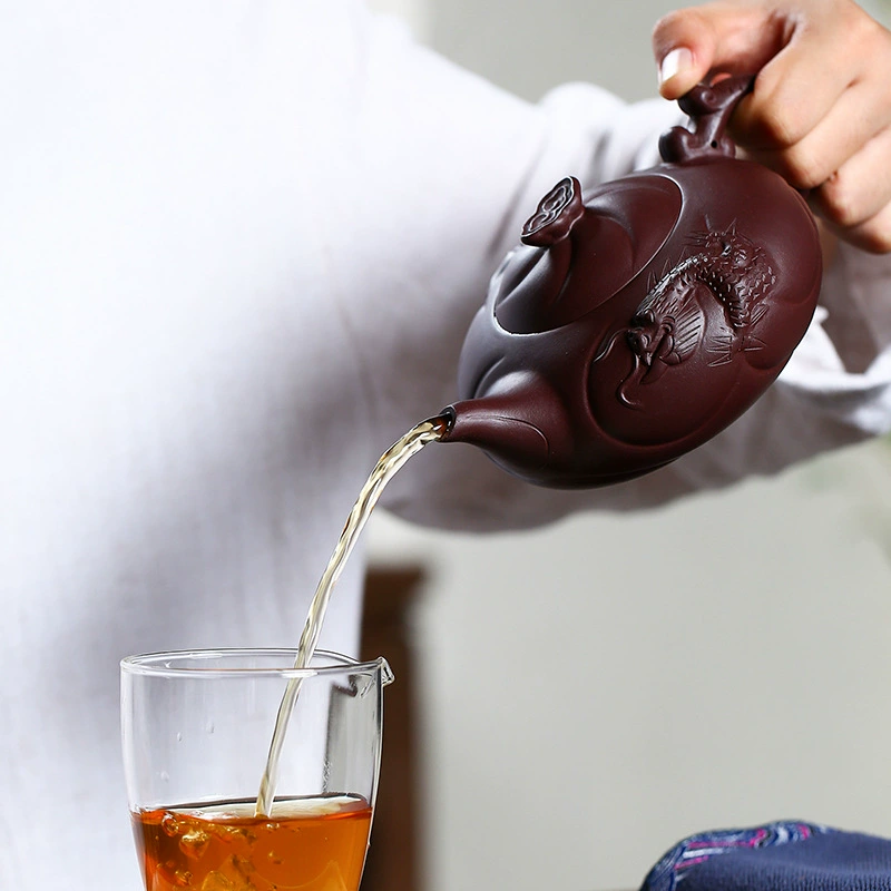 Introduction: This Yuhualong teapot is ingeniously designed, with fish, dragon and cloud decorations blending perfectly with the pot body. The whole pot is shaped like rolling waves, with smooth and concise lines. The vivid dragon tail handle adds a touch of fun, making it a lively and energetic Zisha artwork.