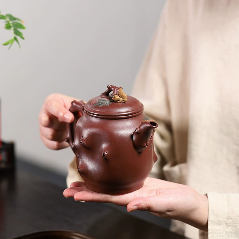 This teapot integrates natural animals and plants into purple clay art, bringing a relaxed and pleasant life vibe. Clusters of grapes symbolize harvest, prosperity and longevity, while the cute squirrel represents blessings of many children and a thriving family, conveying auspicious wishes.