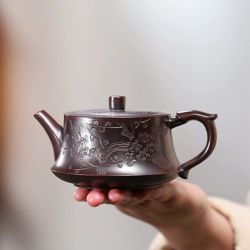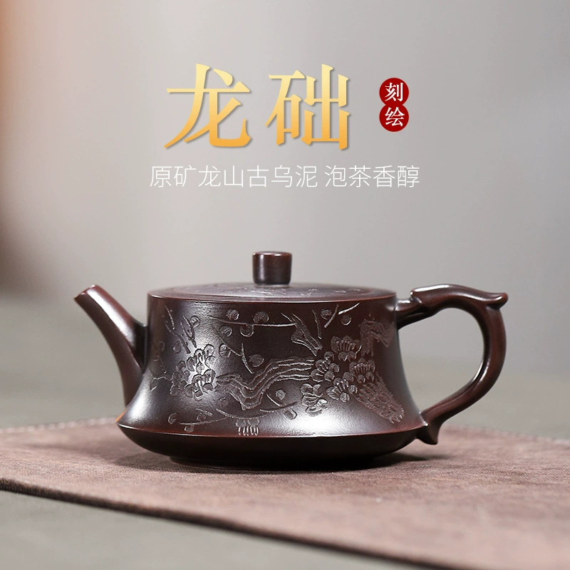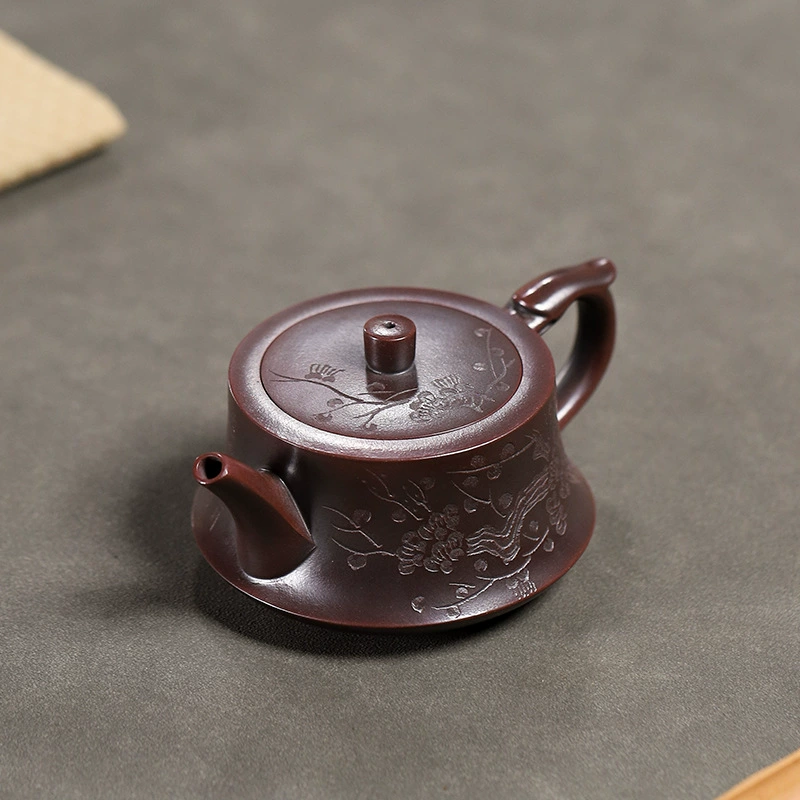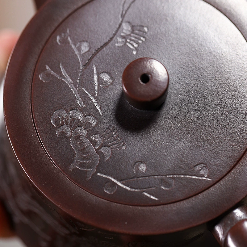 This Longchu Teapot is an innovative variant of the traditional Zhuchi (Column Base) Teapot, a classic handmade Yixing purple clay teapot style. It replaces the classic “ring ear handle” with a “dragon-shaped teapot handle”, combining the stability of the Zhuchi Teapot with the vividness of dragon patterns. As one of the “Mansheng Eighteen Styles” of Yixing purple clay teapots, the Zhuchi Teapot draws inspiration from the “column base stone” in ancient Chinese architecture—a stone pier that supports wooden columns. Featuring a shape that is small at the top and large at the bottom, rounded and solid, with a tightly fitting lid and mouth, it is a representative of “stability and grace” among round Yixing purple clay teapots.
