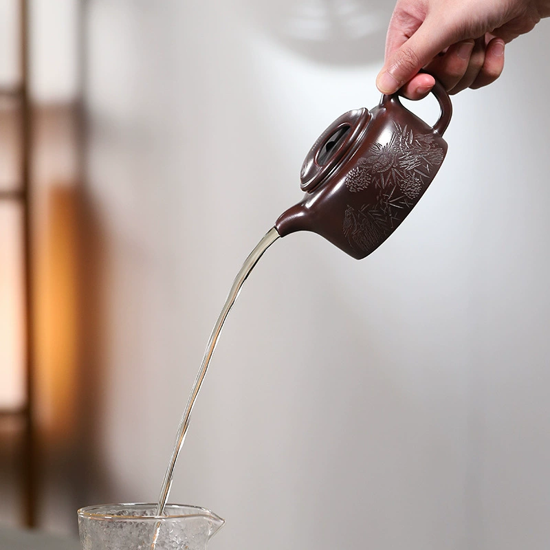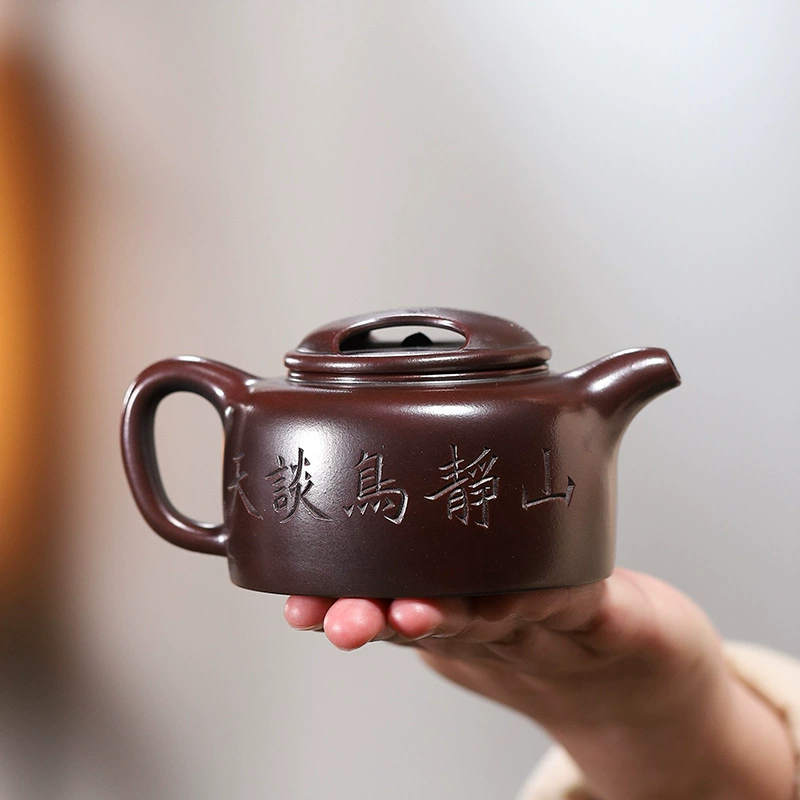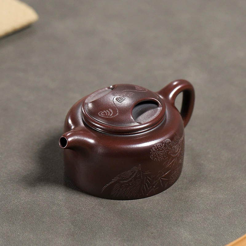This is the Niugai Lianzi Teapot, a representative model among traditional round Yixing purple clay teapots. It combines two classic Yixing purple clay elements: “Niugai” (Ox-Cover) and “Lianzi” (Lotus Seed). The teapot lid adopts a hollowed-out “Niubikong” (Ox-Nose Hole) structure—symmetrical elliptical holes shaped like an ox’s nose, which combines fun and practicality. The elliptical holes (ox-nose) on the lid are the iconic feature, and when combined with the traditional Lianzi (Lotus Seed) teapot shape, it presents a simple, ancient and solid style.