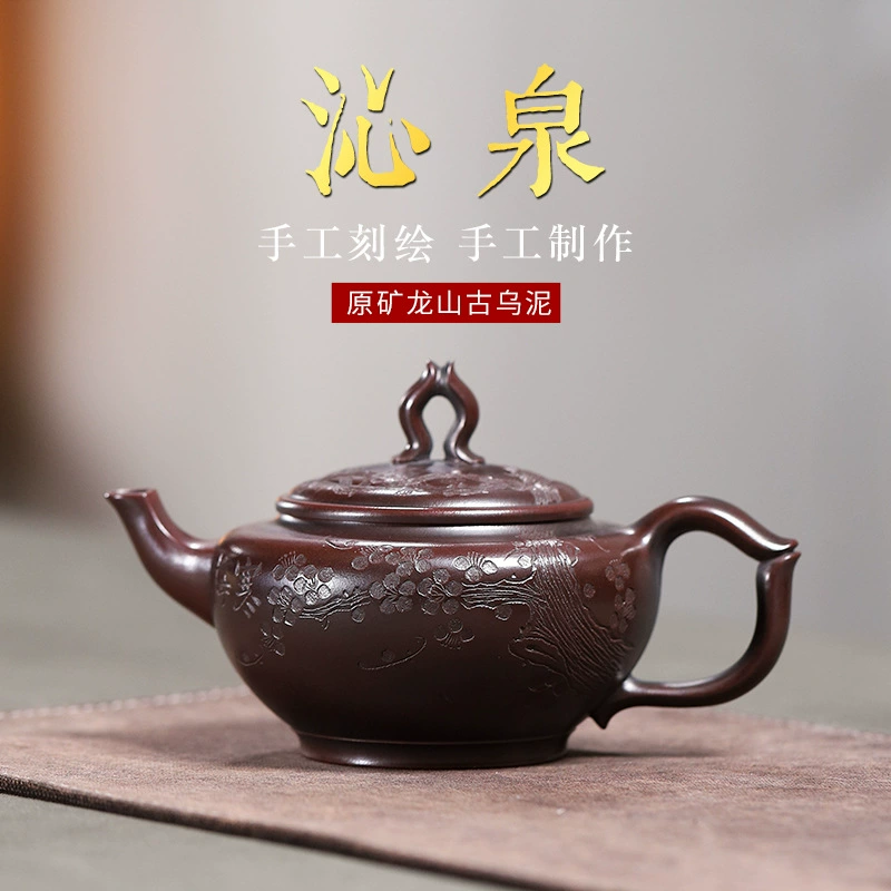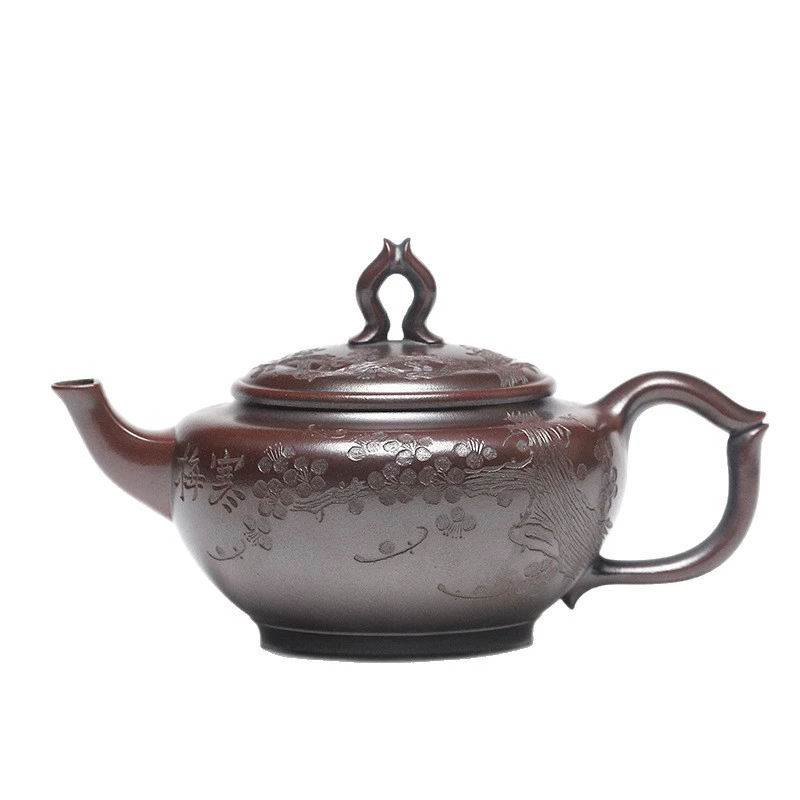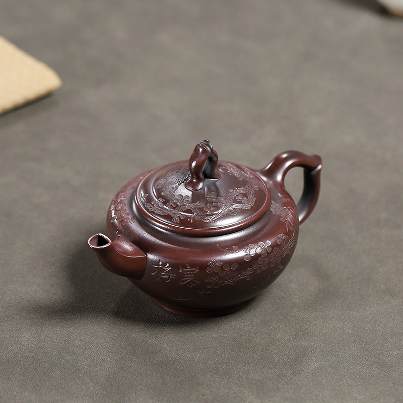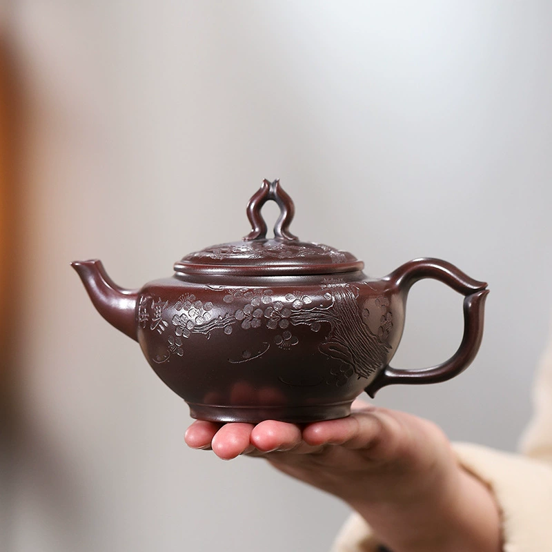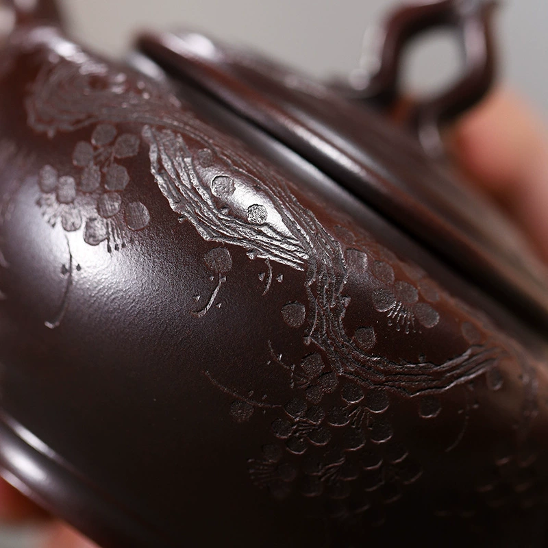 The entire body and lid are adorned with embossed plum blossom patterns (with clear petals and delicate textures). Plum blossoms symbolize “tenacity and integrity”; the hand-carved plum blossom craftsmanship adds visual layers and artistic charm, making the teapot both practical and ornamental.