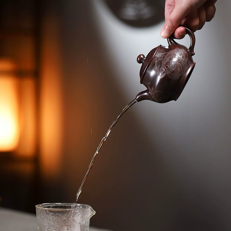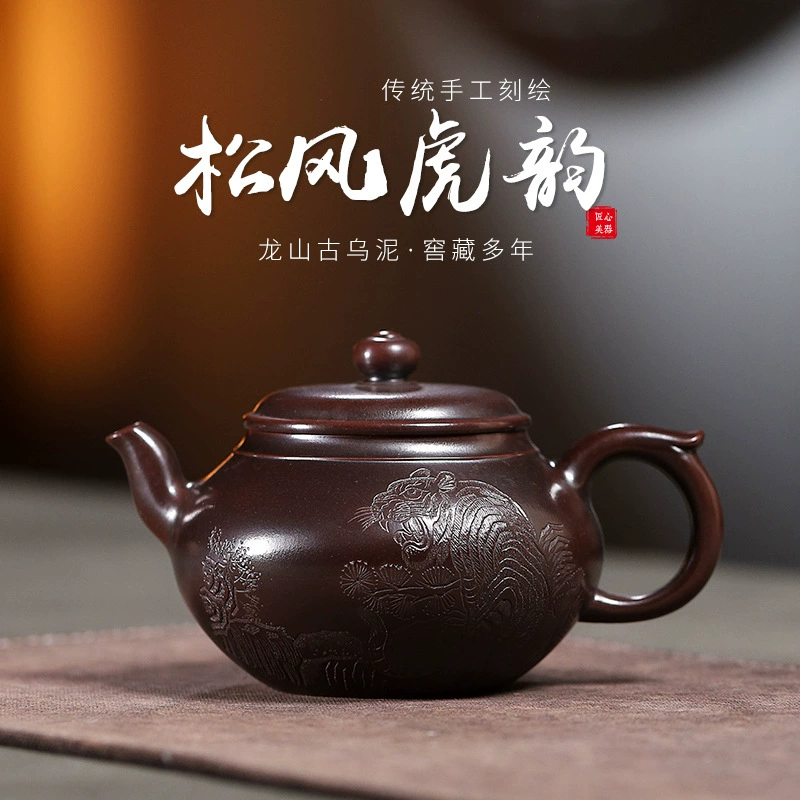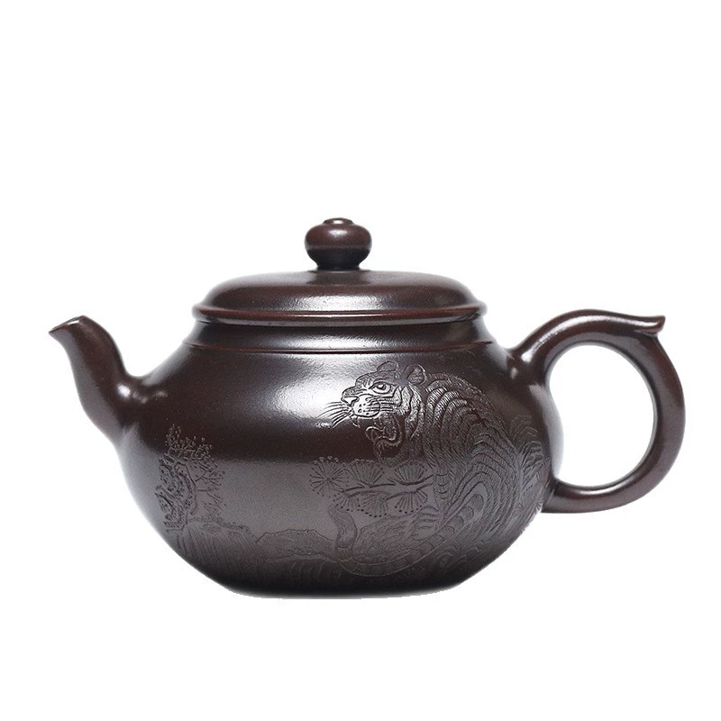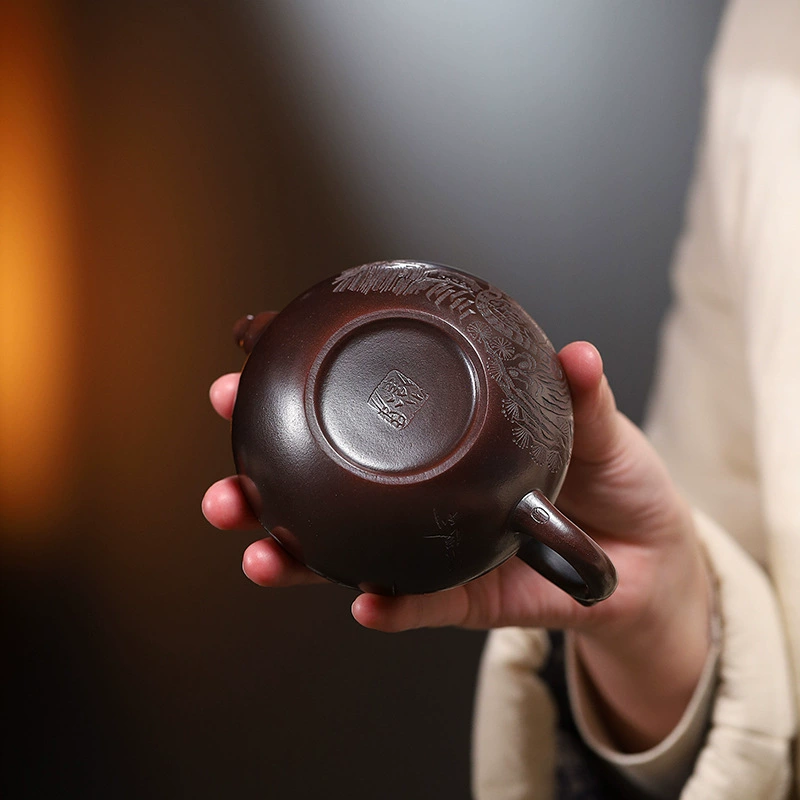 The smooth, rounded pot body provides a generous “carving canvas”, which perfectly presents the intricate details of tigers and pine branches, allowing the patterns to stretch freely. Its plump and full shape inherently exudes an aura of “steadiness and grandeur”, which highly aligns with the cultural imagery of “the tiger’s dignity and the pine’s ruggedness”. This harmonious integration makes the craftsmanship and the pot shape a unified artistic style. It is a perfect combination of “classic shape + cultural decoration”, which not only retains the practicality of traditional teapots but also endows the product with unique artistic recognition through exquisite hand-carving.