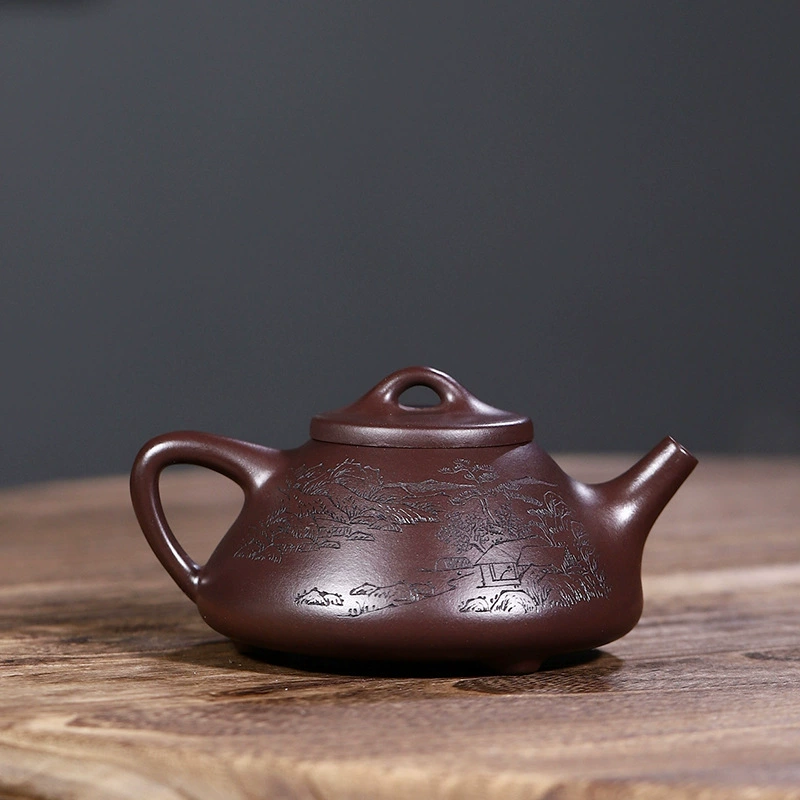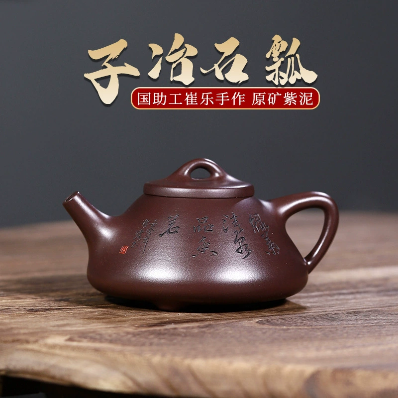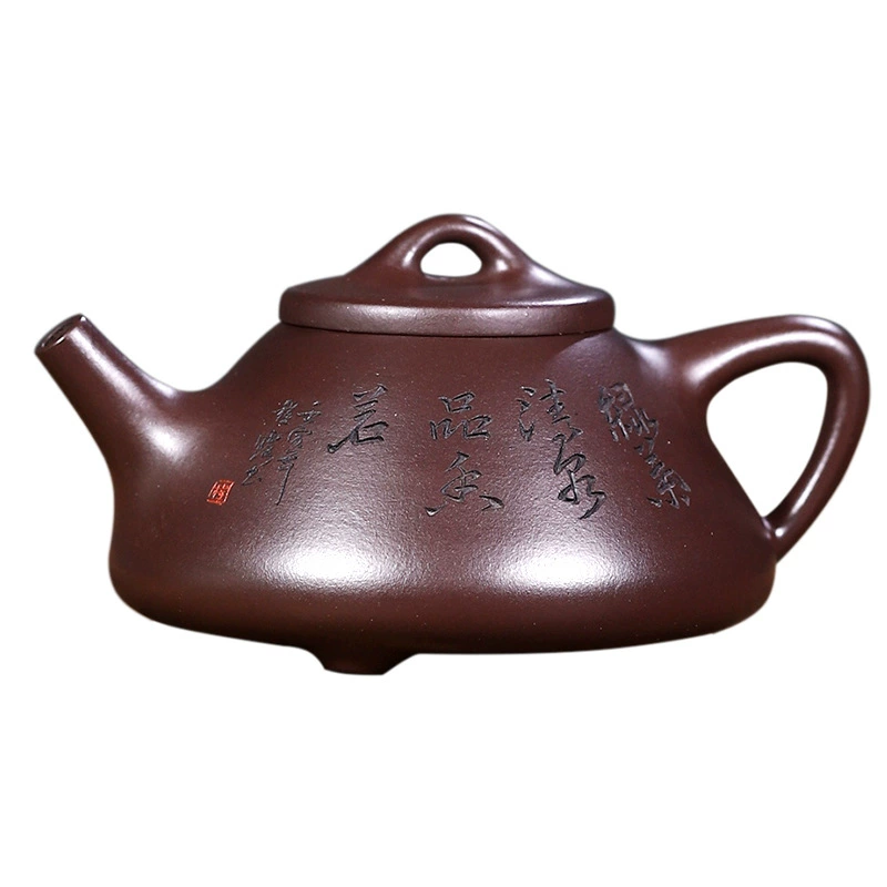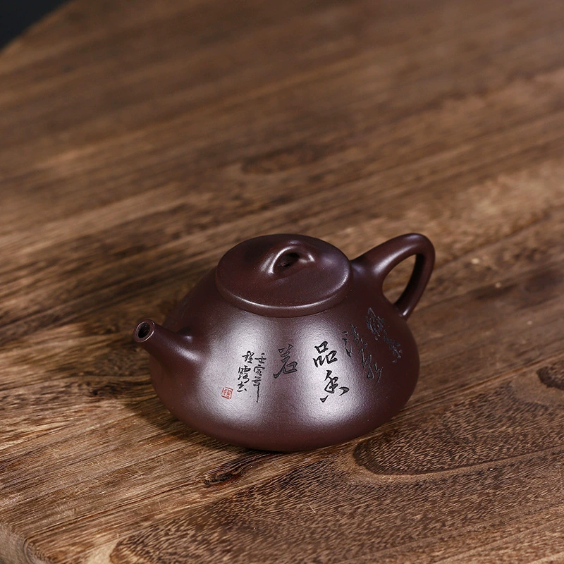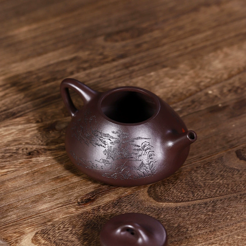 This is a Ziye Shipiao teapot crafted from original ore purple clay, hand-made by Cui Le, a national senior assistant craft artist. Its body stands tall with a stable and neat triangular structure. The front is carved with inscriptions in bold and forceful strokes, while the back features landscape carvings with a distant artistic conception. The moist purple clay complements the carvings perfectly, combining practicality with the refined taste of literati.